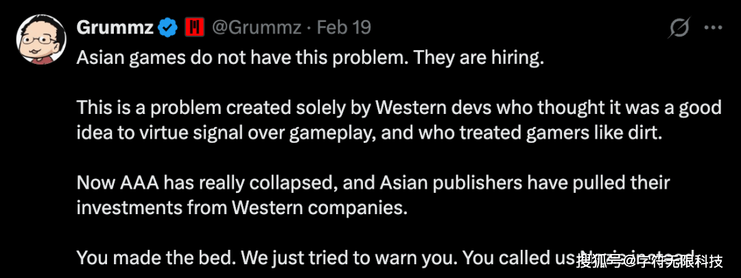 现在的局面完全是西方开发者自己一手造成的——他们自作聪明地认为搞美德宣示(政治正确)比打磨游戏玩法更重要,而且把玩家视如草芥。