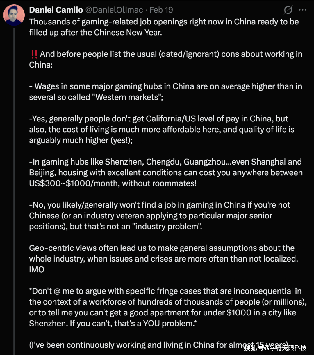 “春节过后,中国有成千上万个游戏相关的岗位空缺正在招人。在大家开始列举那些关于中国从业环境的偏见性观点之前,我想澄清几点:
