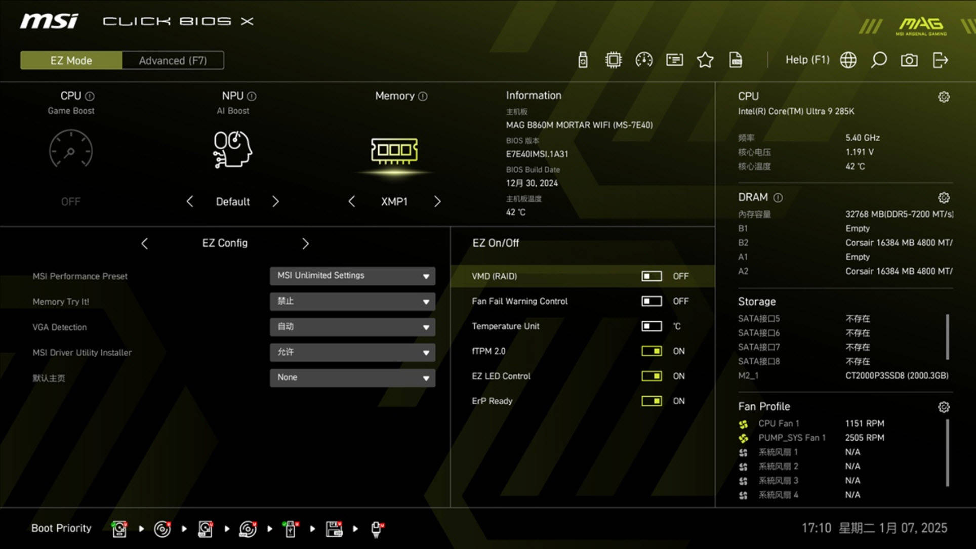 BIOS与软件功能的优化,让这款主板的使用体验更加便捷,无论是新手玩家,还是资深DIY爱好者,都能轻松上手。主板采用新版Click BIOS X界面,操作逻辑清晰,功能归类合理,支持鼠标操作,即使是新手,也能快速熟悉BIOS的各项设置。BIOS支持4档性能模式(默认/Performance/Extreme/Unlimited),可调节CPU功耗墙和内存优化设置,同时提供了NPU AI Boost三档调节功能,可以进一步提升AI计算性能,充分发挥内置NPU的潜力,经微星超频实验室测试,AI Boost可实现高达27%的NPU性能提升。