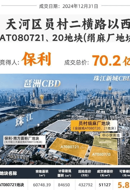 回顾2024年底,保利以雷霆之势,斥资70.2亿元底价拿下了绢麻厂地块。这一动作不仅彰显了央企保利在广州市场的坚定信心,更预示着这片区域将迎来翻天覆地的变化。地块分为AT080720(北)和AT080721(南)两个部分,楼面价分别达到5.07万/㎡和5.11万/㎡。这样的地价水平,直接奠定了项目的高端基因。作为广州单价地王排行榜的第十名,保利天曜